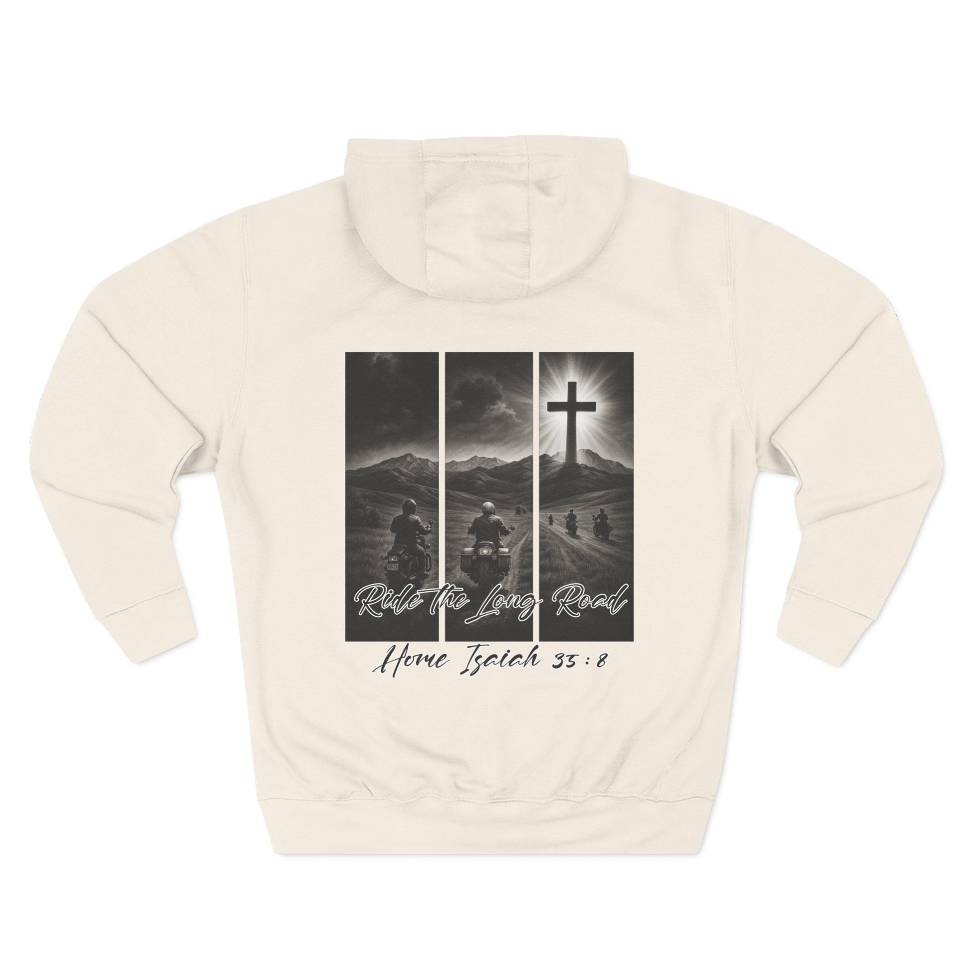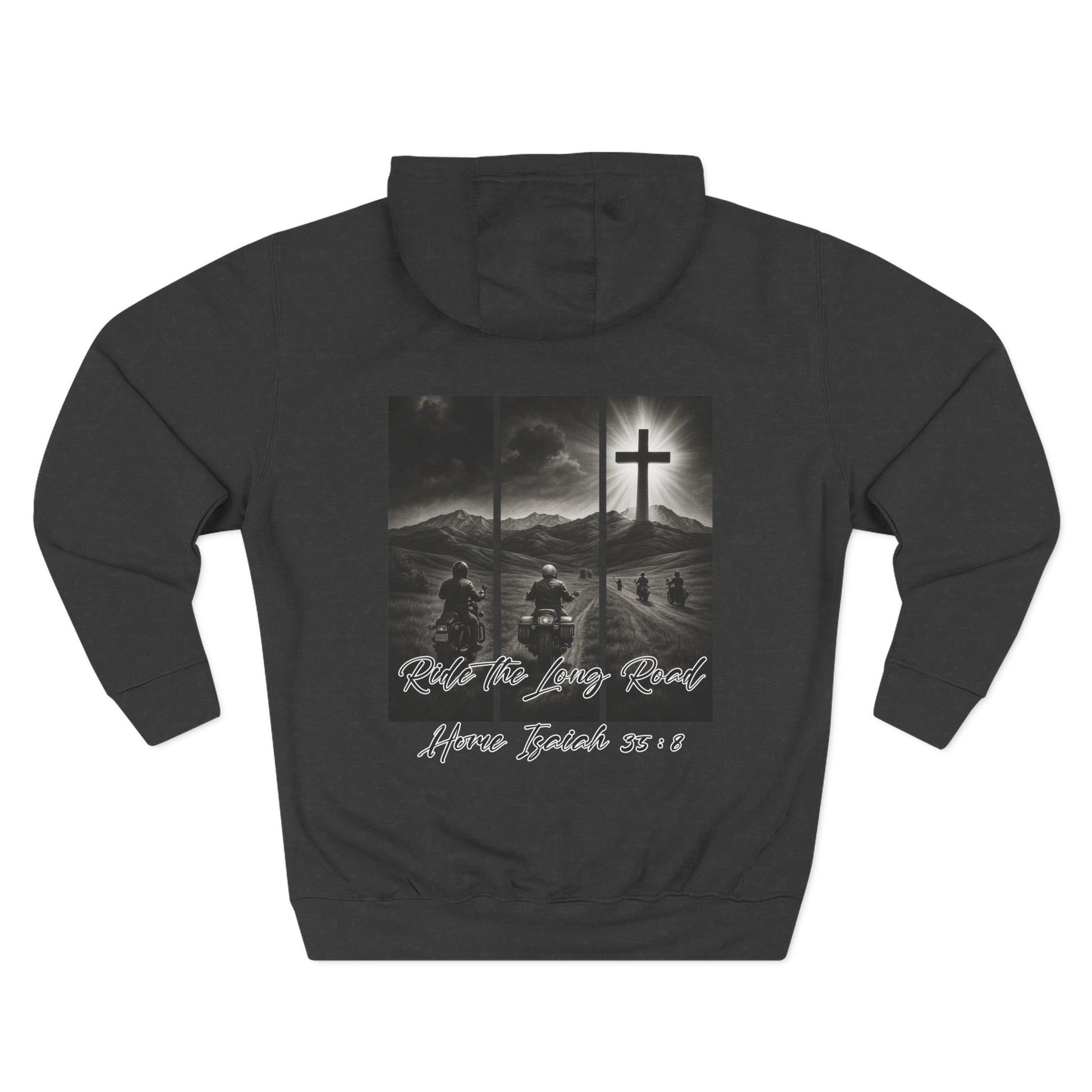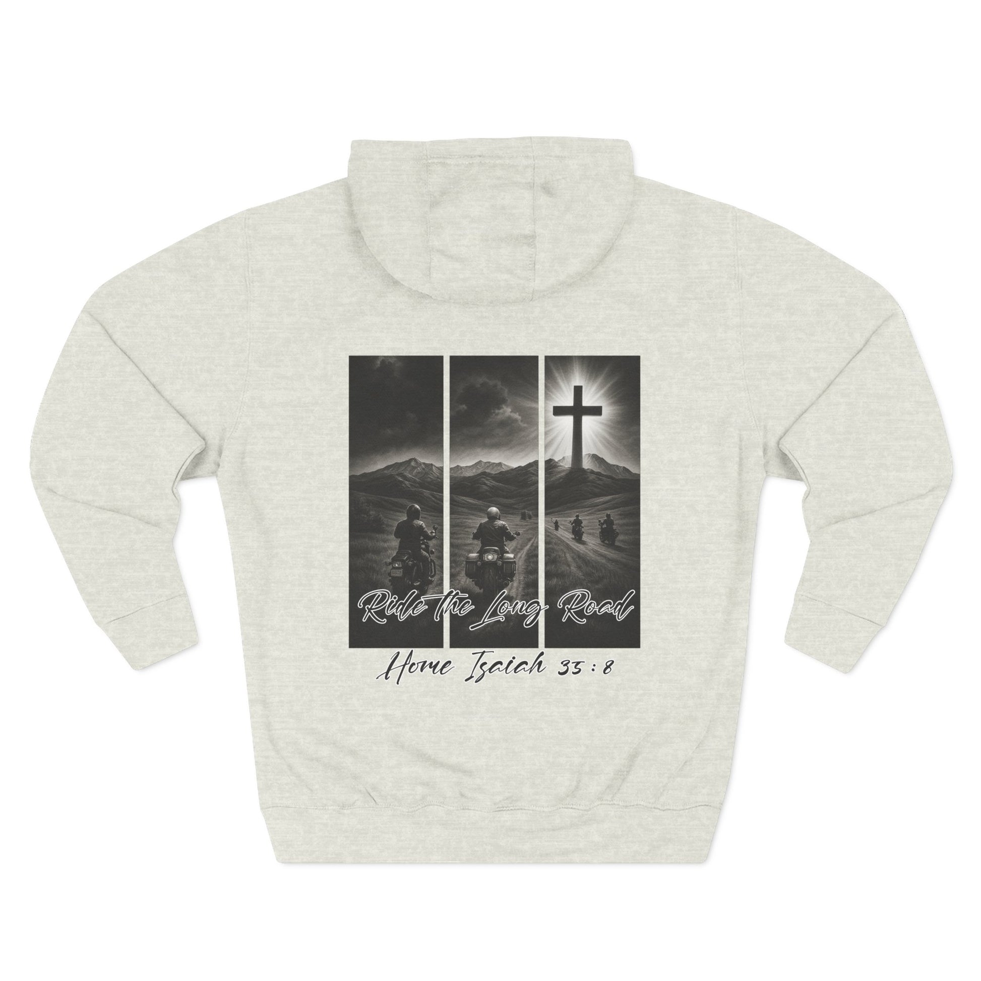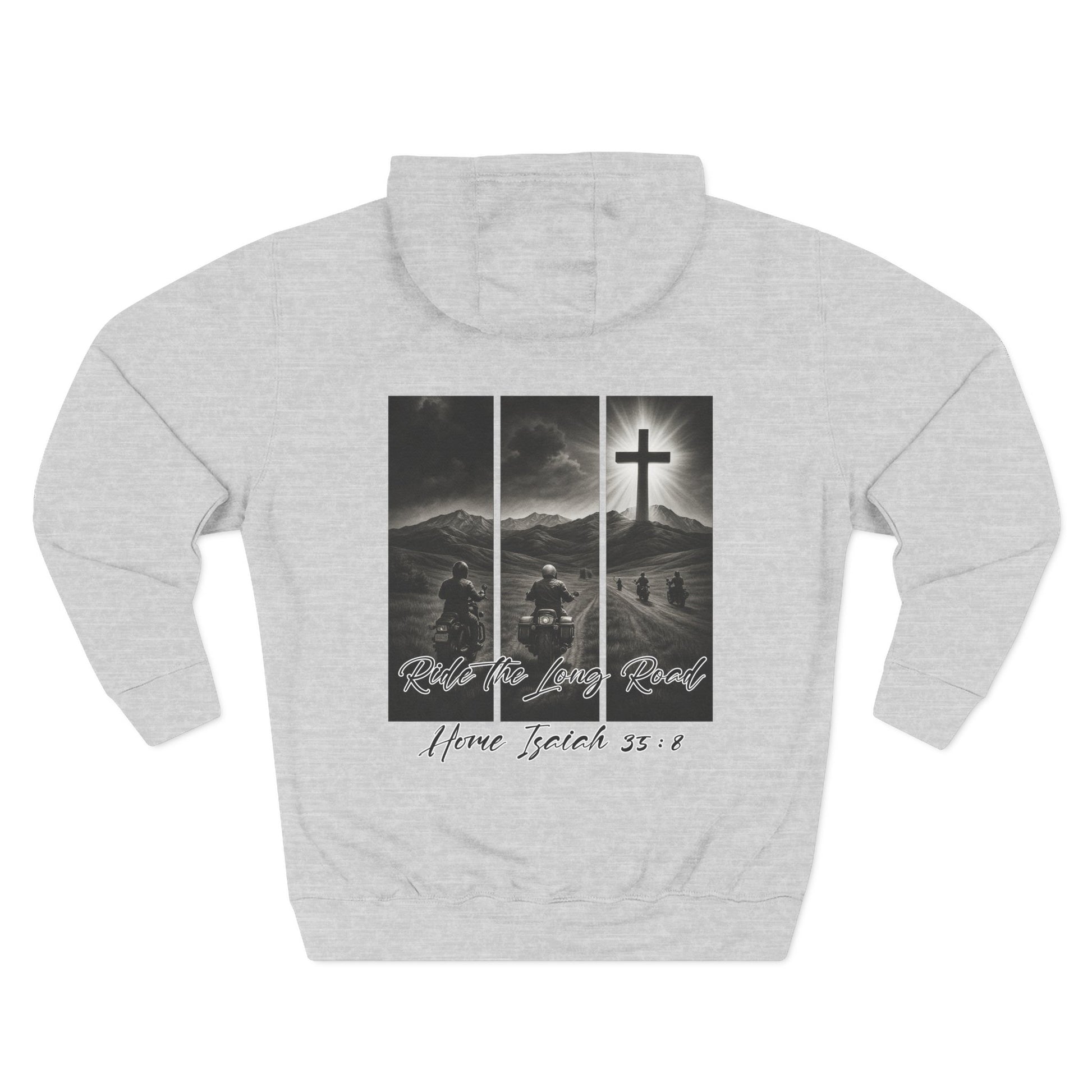 This Christian biker-inspired hoodie from Defiant Creeds brings together faith and the open road — a bold front design reading “FOLLOW THE LIGHT” and a detailed back print showing riders journeying toward the cross beneath scripture from Isaiah 35:8: