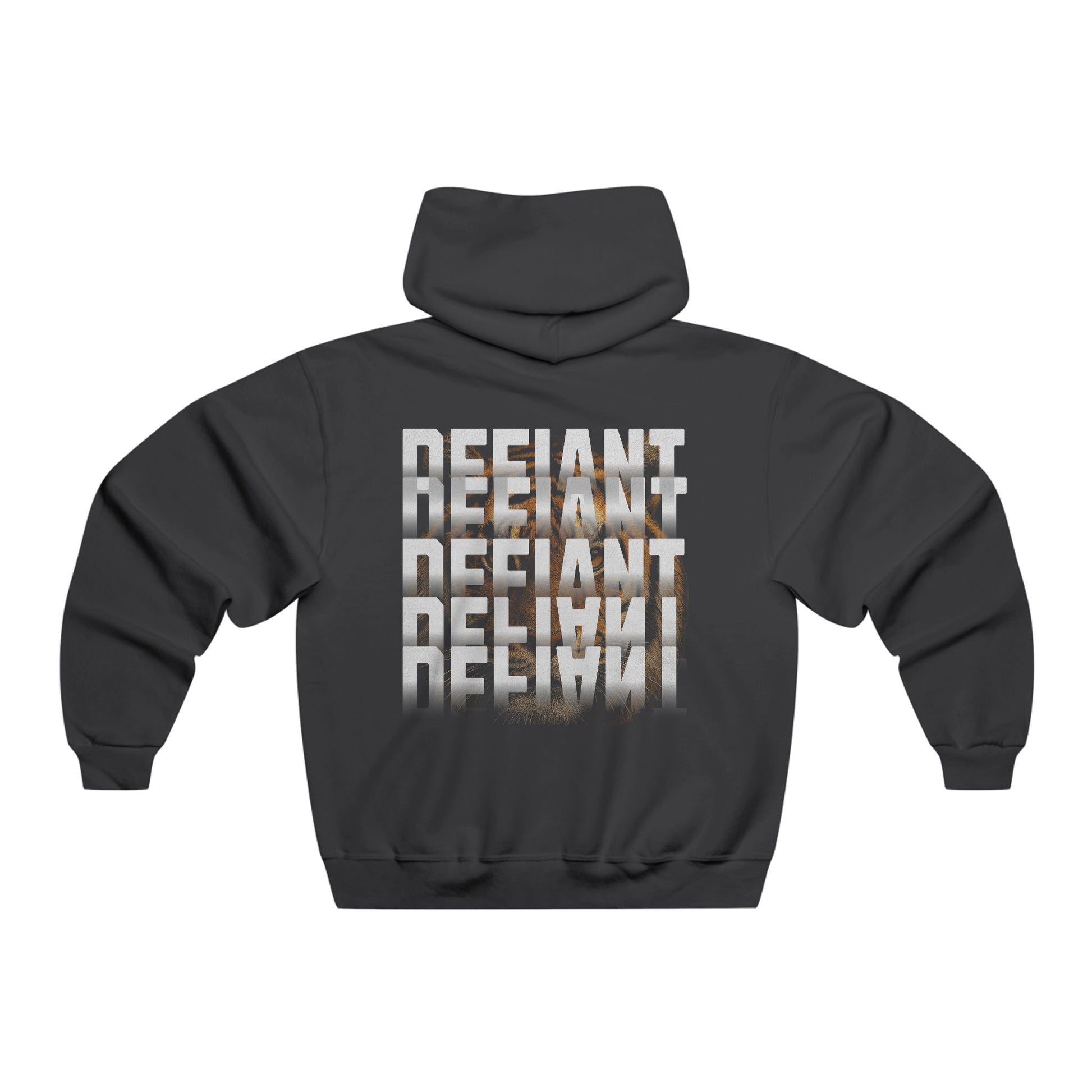 Black hoodie with a bold stacked “DEFIANT” text design in distressed white block letters, repeated vertically for maximum impact. Behind the lettering, a fierce tiger image emerges in earthy tones, its intense gaze and subtle detail adding raw power to the design. The combination of the gritty text and the untamed tiger creates a fearless, streetwear statement piece for those who live unapologetically.