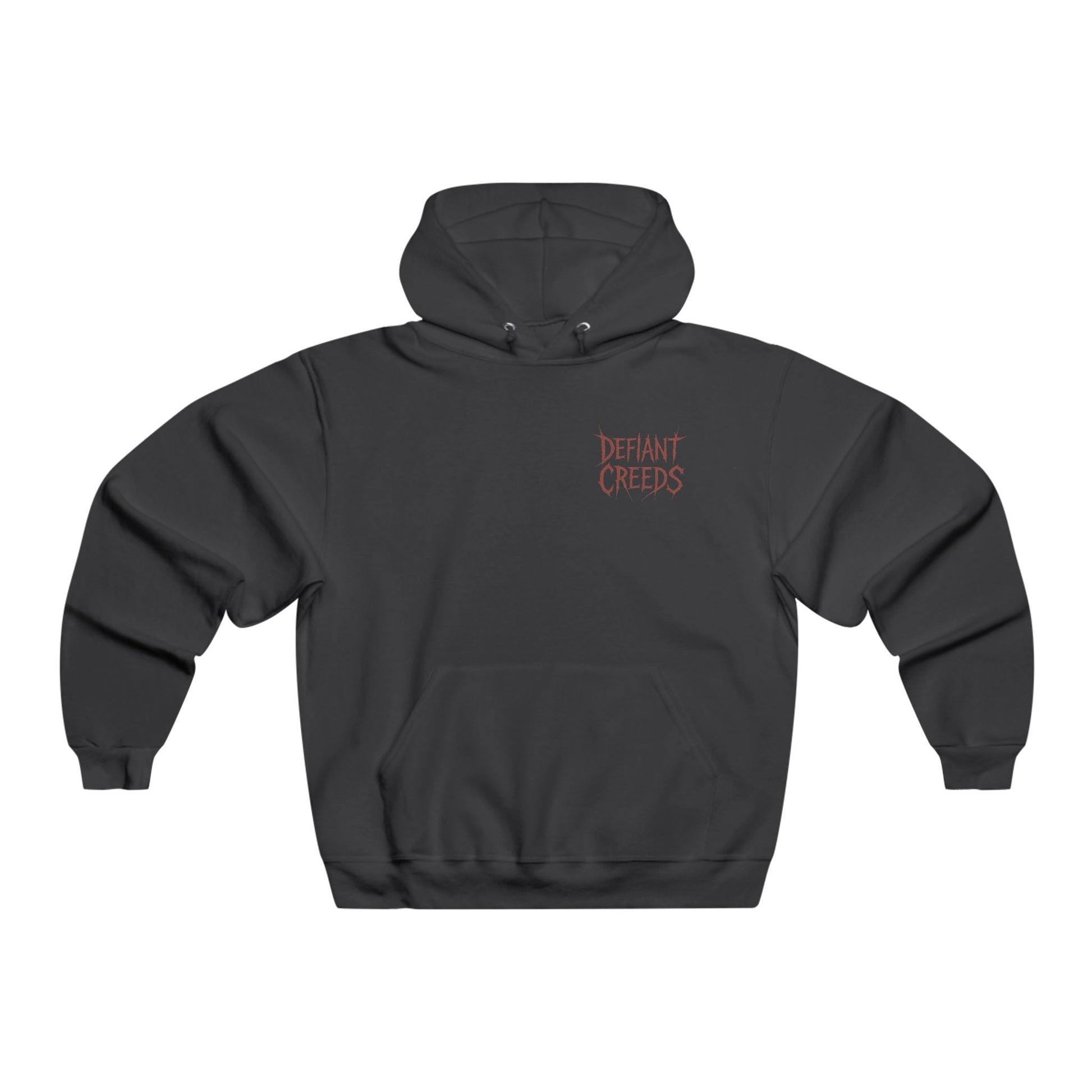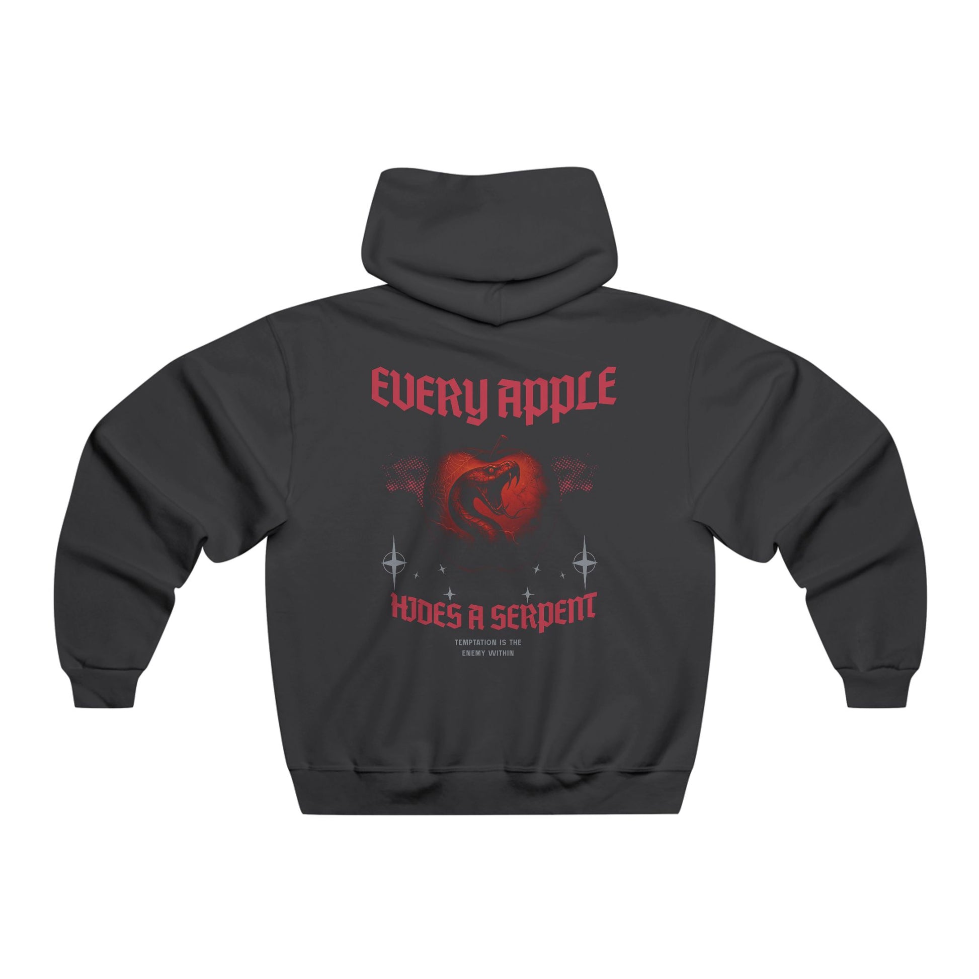 Sin draped in comfort. This heavyweight hoodie features a striking crimson apple cracked open to reveal a coiled serpent within—an eternal symbol of temptation and hidden danger. Gothic red lettering makes the message clear: temptation is the enemy within.