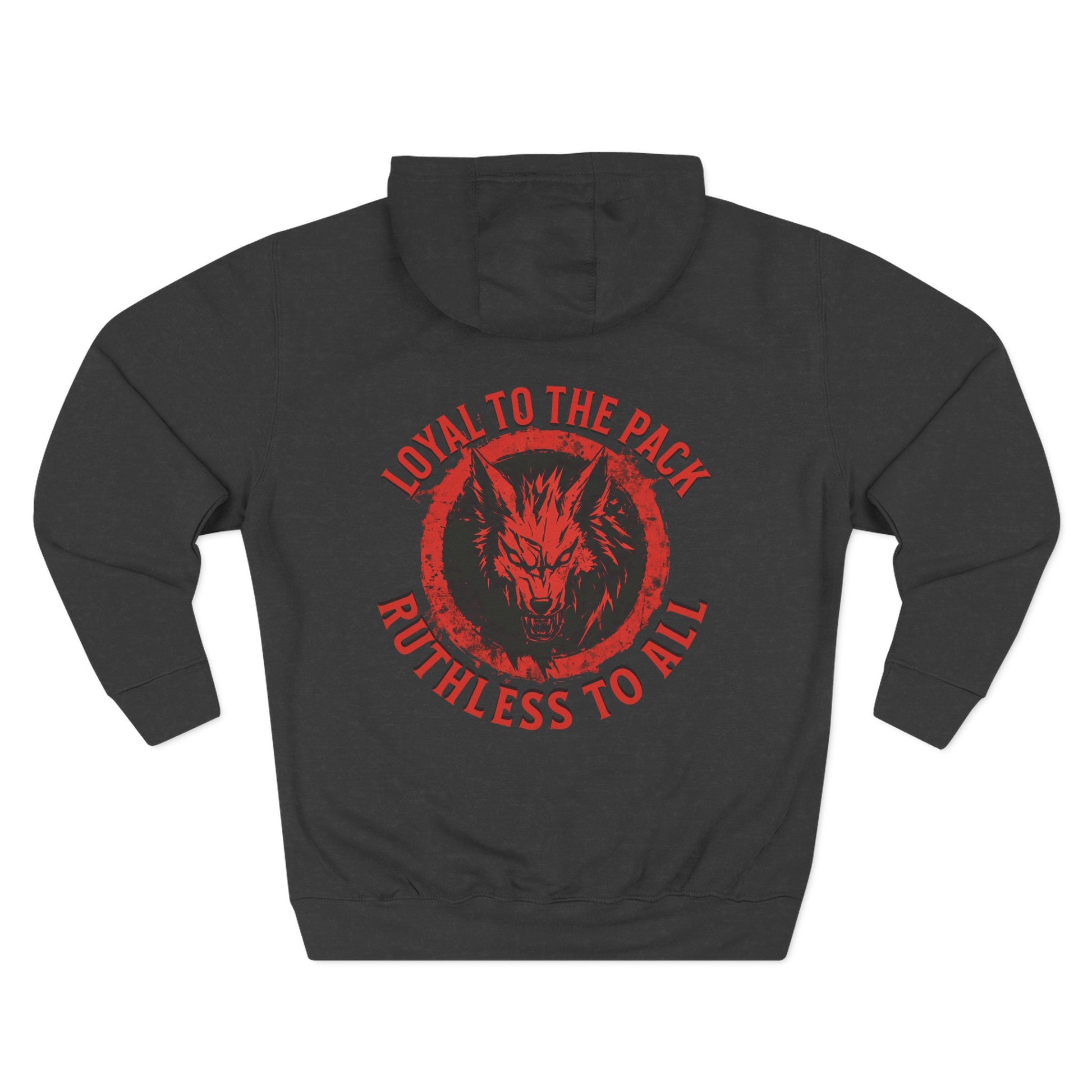 Run with the wolves. This hoodie embodies the code  — loyalty to your own, and zero mercy to anything that stands in your way. Featuring a blood-red feral wolf emblem framed by the words “Loyal to the Pack, Ruthless to All,” this piece captures raw strength, unity, and defiance.
