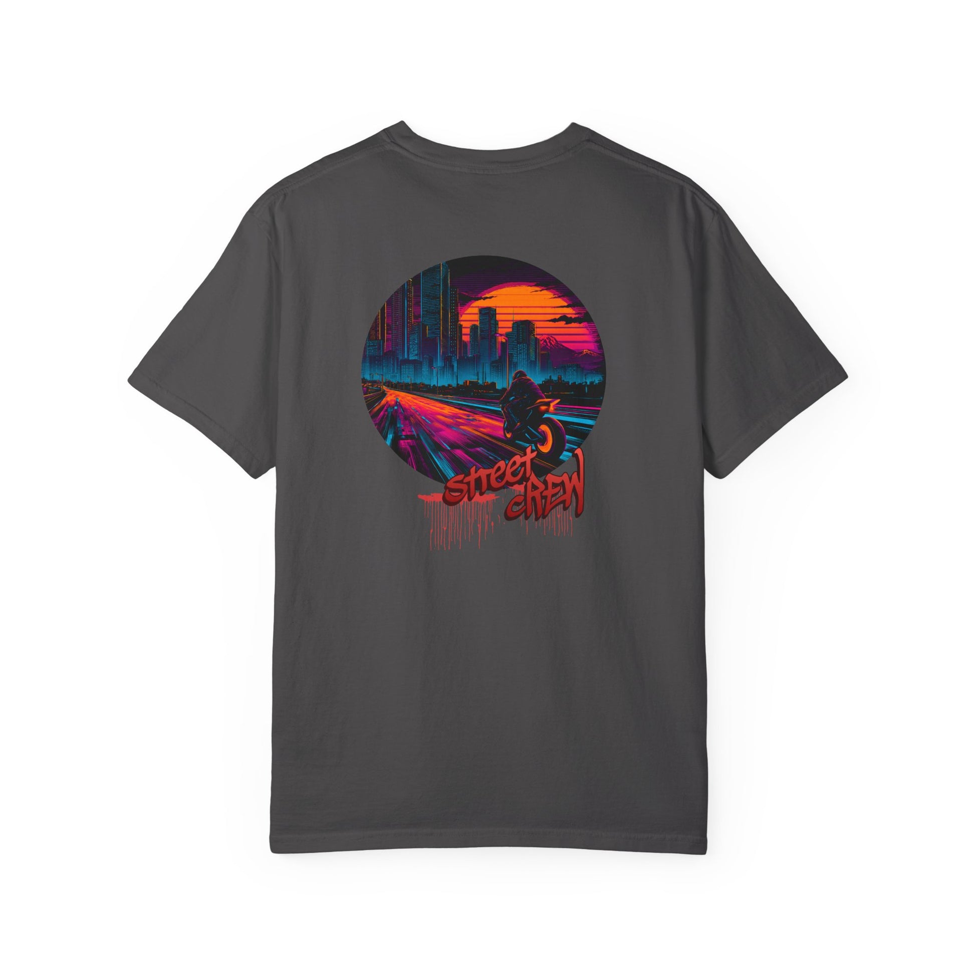 Ignite the streets with the Street Crew Neon Skyline Tee. This black cotton t-shirt features a bold, high-contrast back print of a lone rider tearing down a neon-lit highway, framed against a glowing sunset and futuristic city skyline. The design explodes with vibrant purples, electric blues, and fiery oranges, bringing retro cyberpunk energy to life.